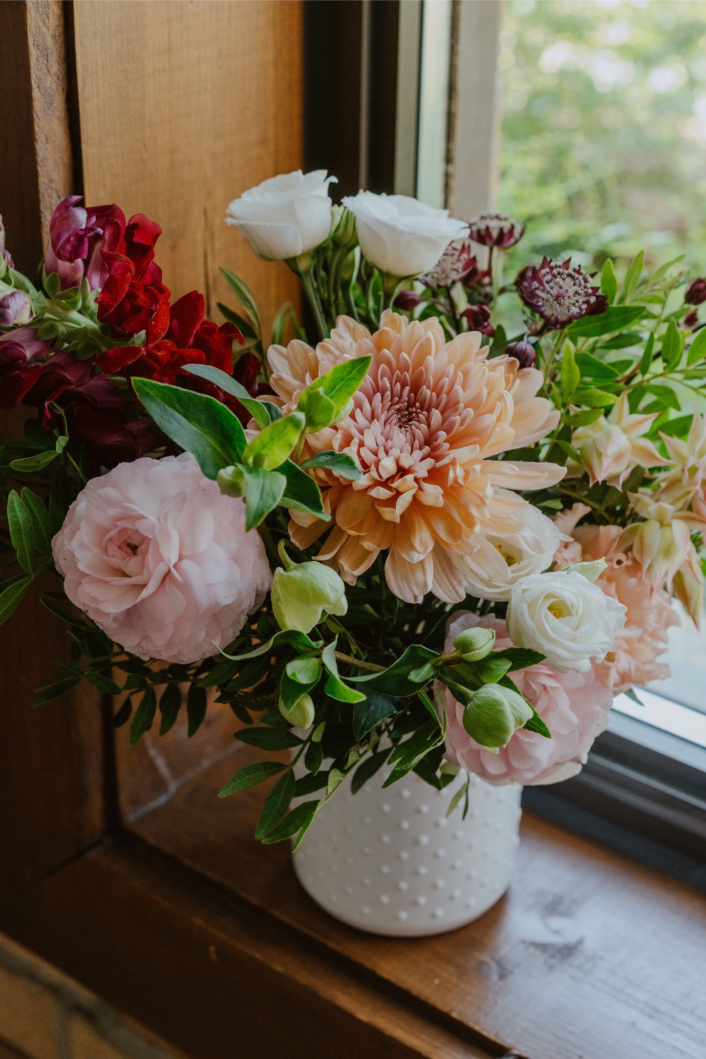 Note: Each floral arrangement we make is unique and designed with fresh, seasonal blooms and greenery. Therefore, the image you see is a representation of the style and size of the arrangement you order. Our flowers change from day to day and from season to season. For instance, in the autumn months, you can expect to see dahlias, while in the spring you will likely see peonies. Please check out our Instagram feed to see what flowers we’re designing with this week.
