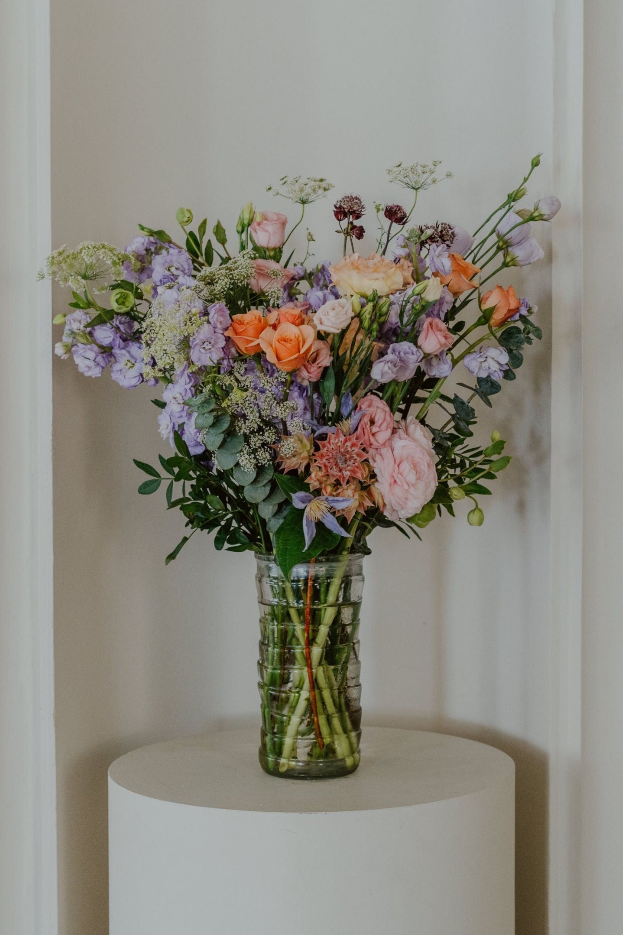 Note: Each floral arrangement we make is unique and designed with fresh, seasonal blooms and greenery. Therefore, the image you see is a representation of the style and size of the arrangement you order. Our flowers change from day to day and from season to season. For instance, in the autumn months, you can expect to see dahlias, while in the spring you will likely see peonies. Please check out our Instagram feed to see what flowers we’re designing with this week.